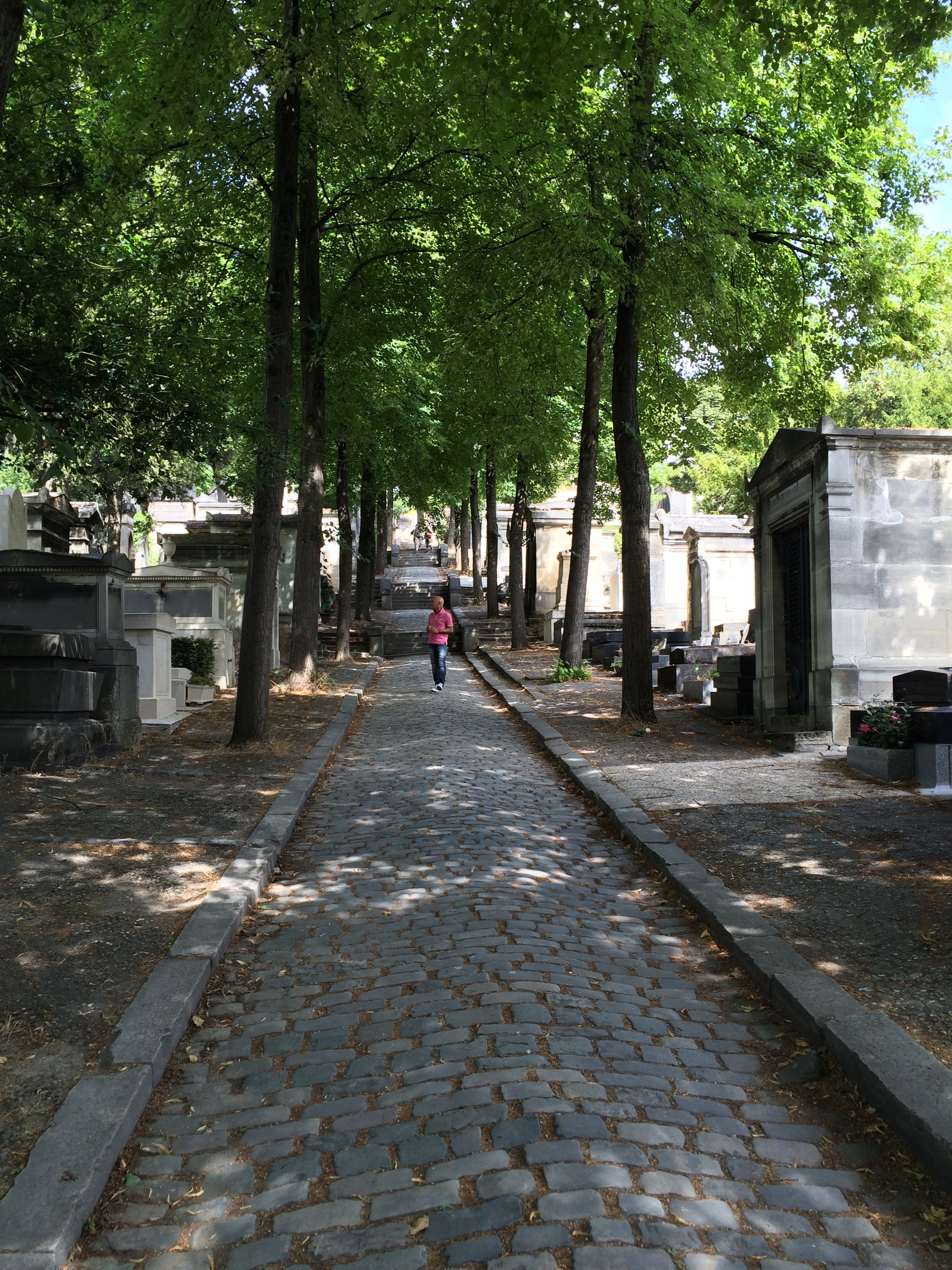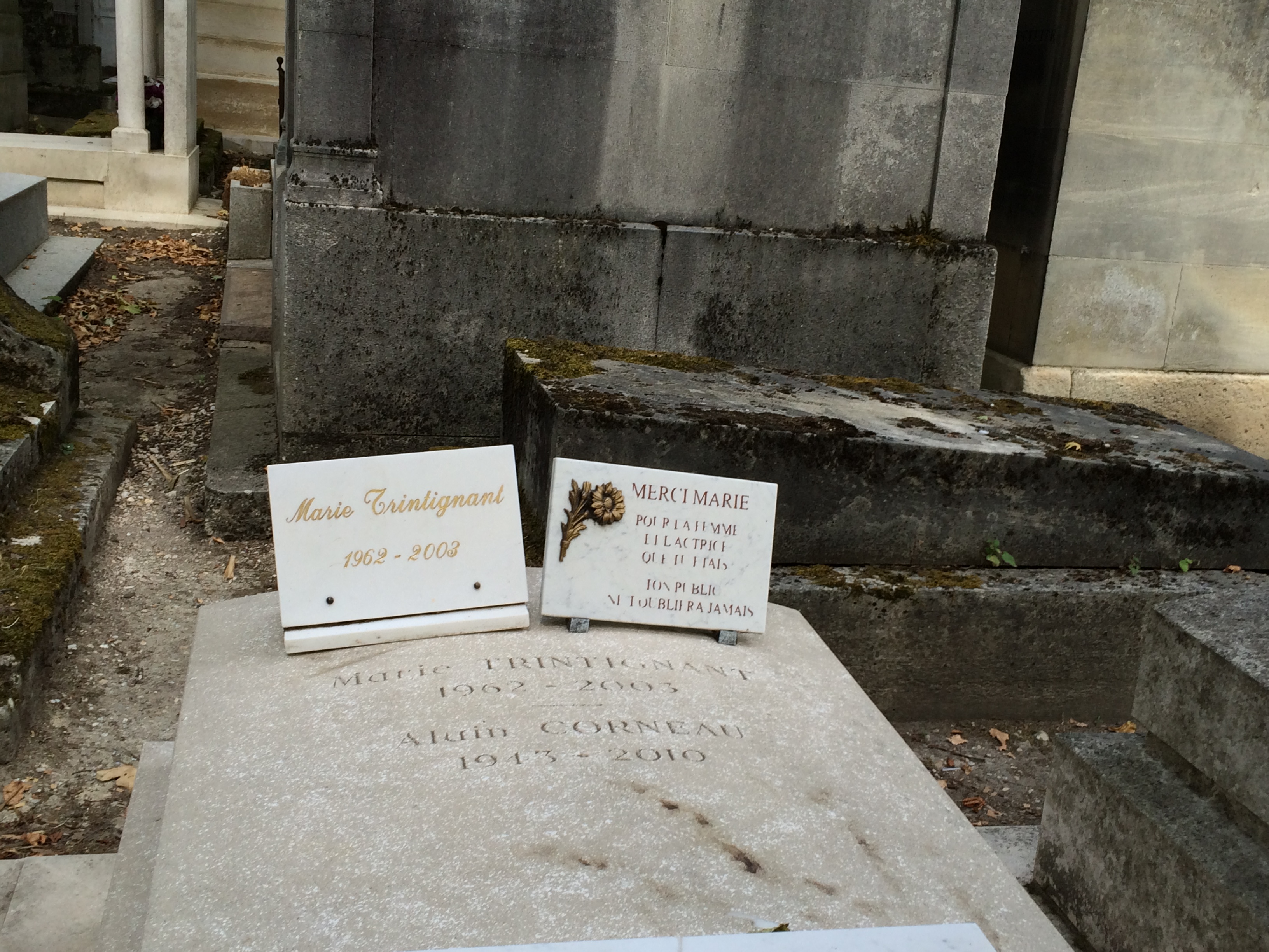 IMG_0355Plus haut, les touristes défilent devant la tombe de Marie, placée à coté de celle de Gilbert Bécaud. Le guide explique l’actrice, son enterrement aux cotés du compagnon de sa mère. Rien rien sur la violence conjugale. Rien sur le fait que c’est l’anniversaire de sa mort. Aucun traitement de l’évènement « mort » aucune remise en contexte. Rien. Les tombes autour sont fleuries, celle de Gilbert Becaud attire, celle de Marie est blanche, nue, triste à mourir.